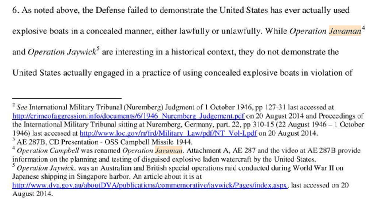 Nor does the story end there. In a curious turn in the Global War on Terrorism. Lawyers for Abdul Rahim al-Nashiri, the mastermind behind the bombing of the USS Cole, raised the issue of Project Javaman in their litigation: